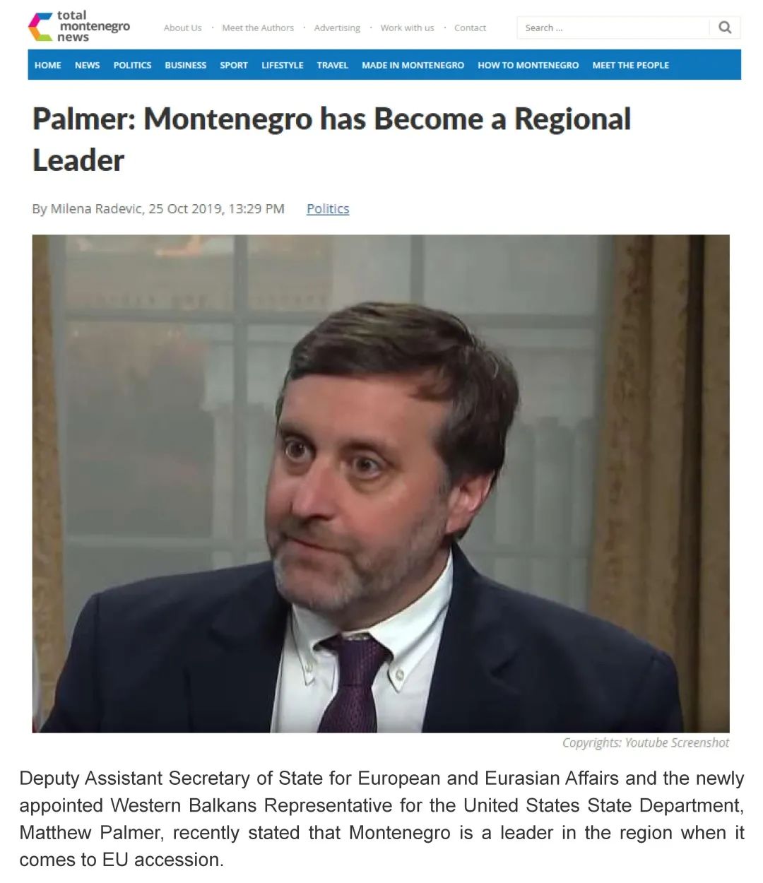 2019年10月,欧洲与欧亚事务局高官马修·帕尔默Matthew Palmer:“黑山是西巴尔干地区加入欧盟进程的领先者!