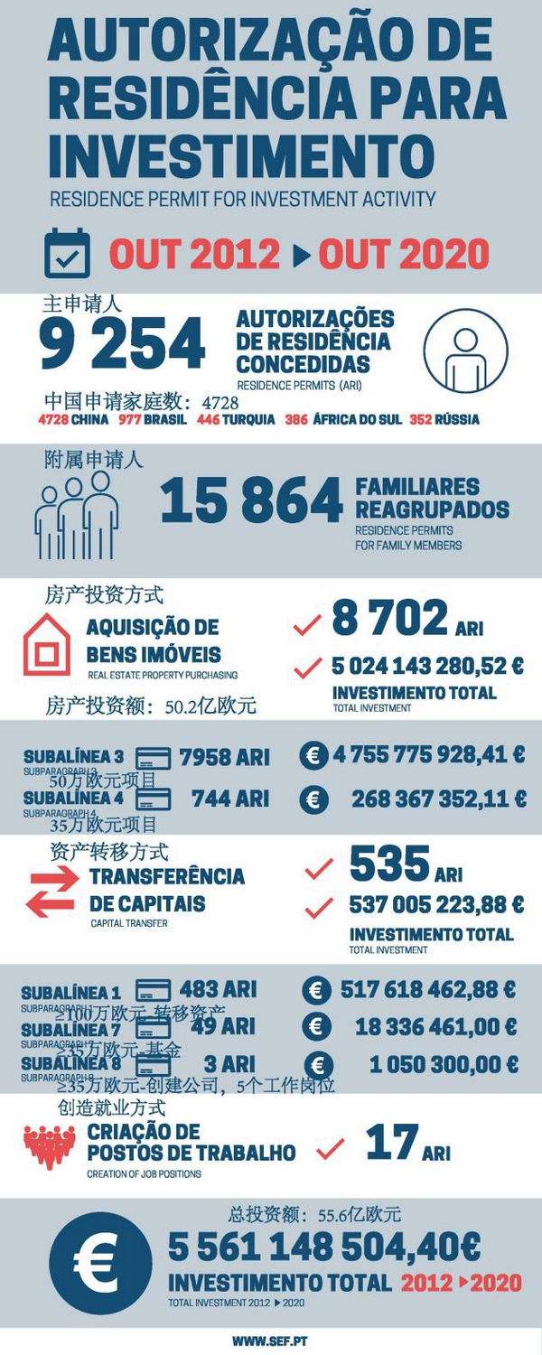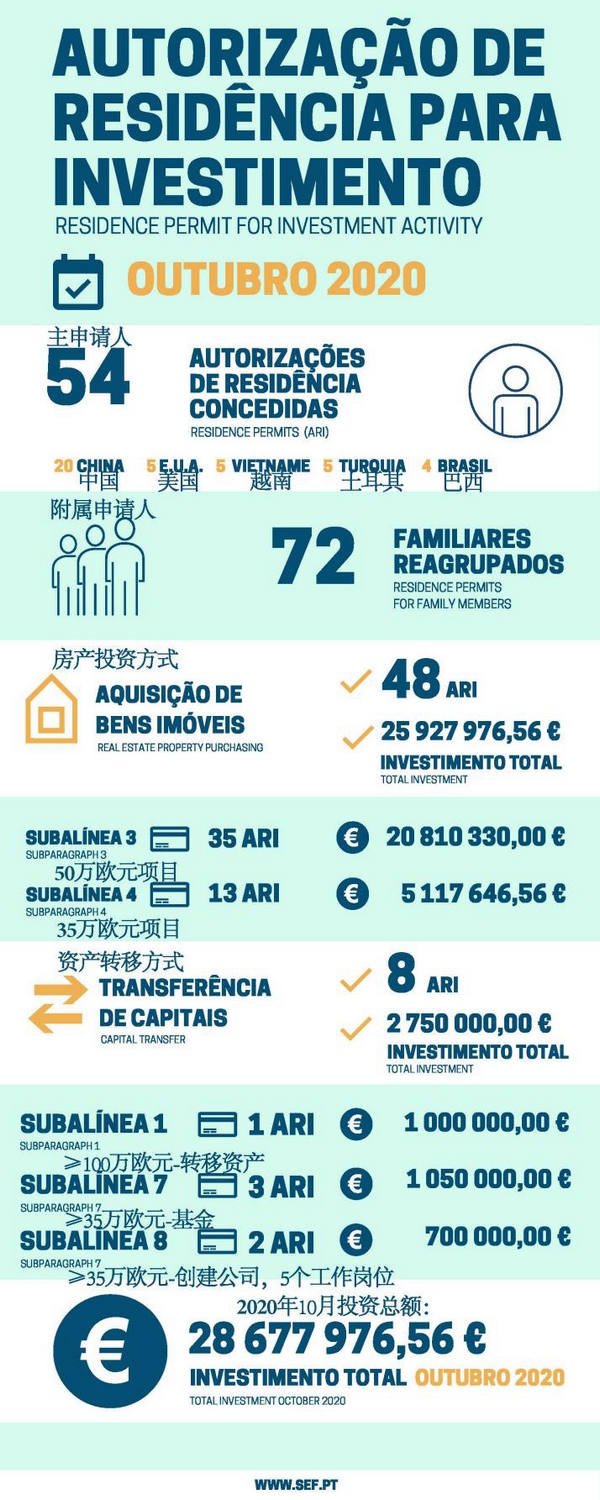 近日,葡萄牙移民局(SEF)公布了2020年10月份黄金签证数据显示,2020年10月共计54位主申请人携72位附属申请人获批葡萄牙黄金签证,投资额达2867.7万欧元。其中,中国投资人依旧领先。