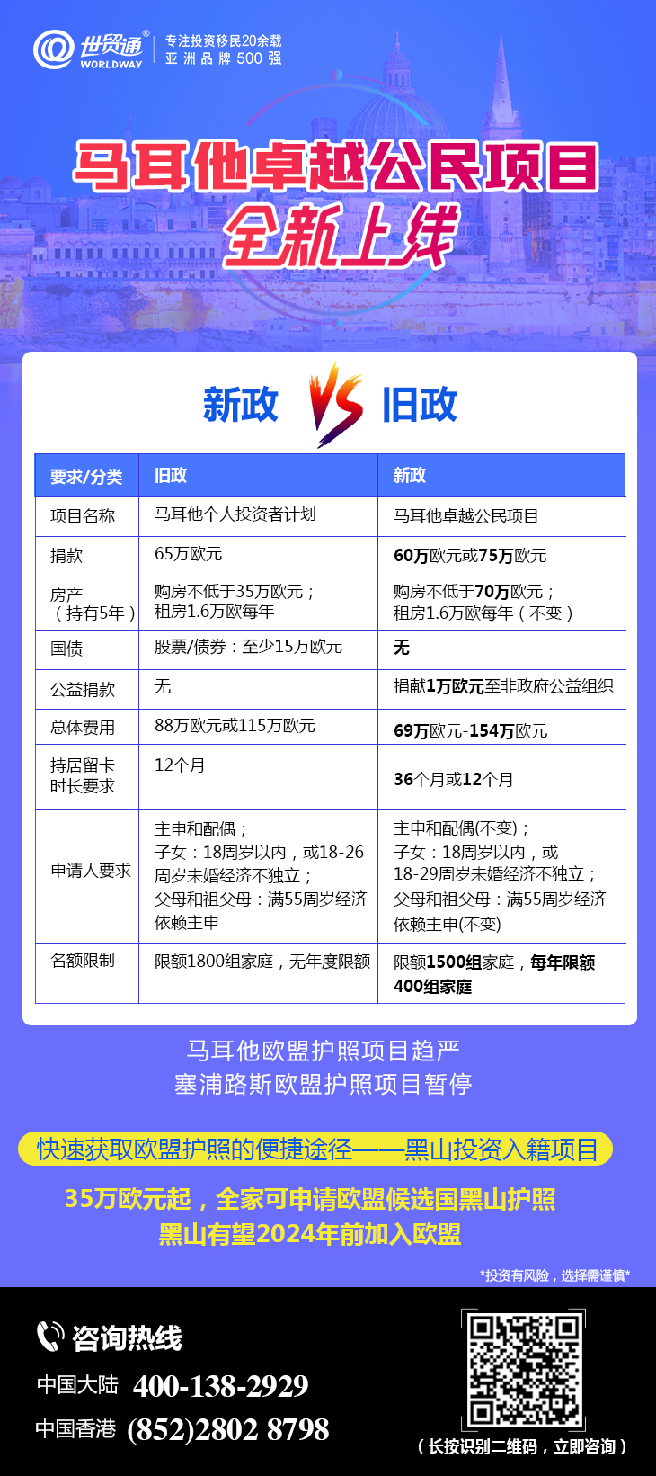 继可一步到位申请欧盟护照的塞浦路斯投资计划关停后,马耳他公民身份项目成为目前移民市场上唯一可一步到位申请欧盟护照的项目。然而,新的马耳他卓越公民项目限额1500组家庭,且在投资要求上更为严格,对于有意向申请欧盟护照的投资者而言,获取欧盟护照的途径越来越窄了。纵观目前欧洲国家推出的移民项目里,快速获取欧盟护照还有黑山投资入籍项目这条便捷途径!