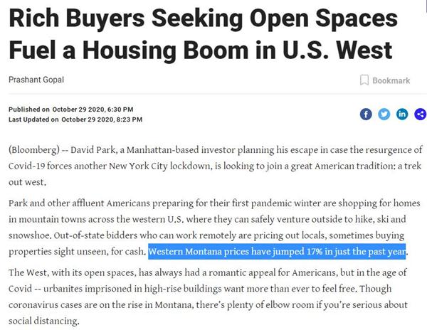 新冠疫情对人们的生活方式和置业观念产生了巨大影响。人们对健康的渴望以及安全感的需求不断增强,越来越多的人选择从拥挤的大城市逃离开来,涌入美国山区以保持安全社交距离。美国媒体Bloomberg报导文章显示,新冠疫情后,位于美国西北部的蒙大拿州成为富人们的热门投资地。在过去一年时间里,蒙大拿西部的房价逆势上涨17%。