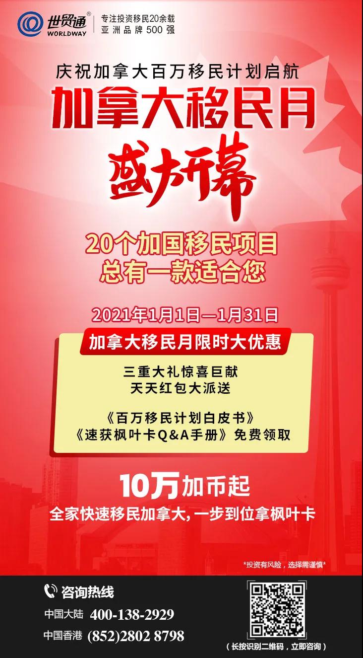 目前,正值加拿大移民月期间,限时大优惠正火爆进行中,三重大礼惊喜巨献,天天红包大派送,《百万移民计划白皮书》、《速获枫叶卡Q&A手册》免费领取。更多优惠,请咨询世贸通集团服务热线,中国大陆:400-138-2929 中国香港:(852) 2802 8798