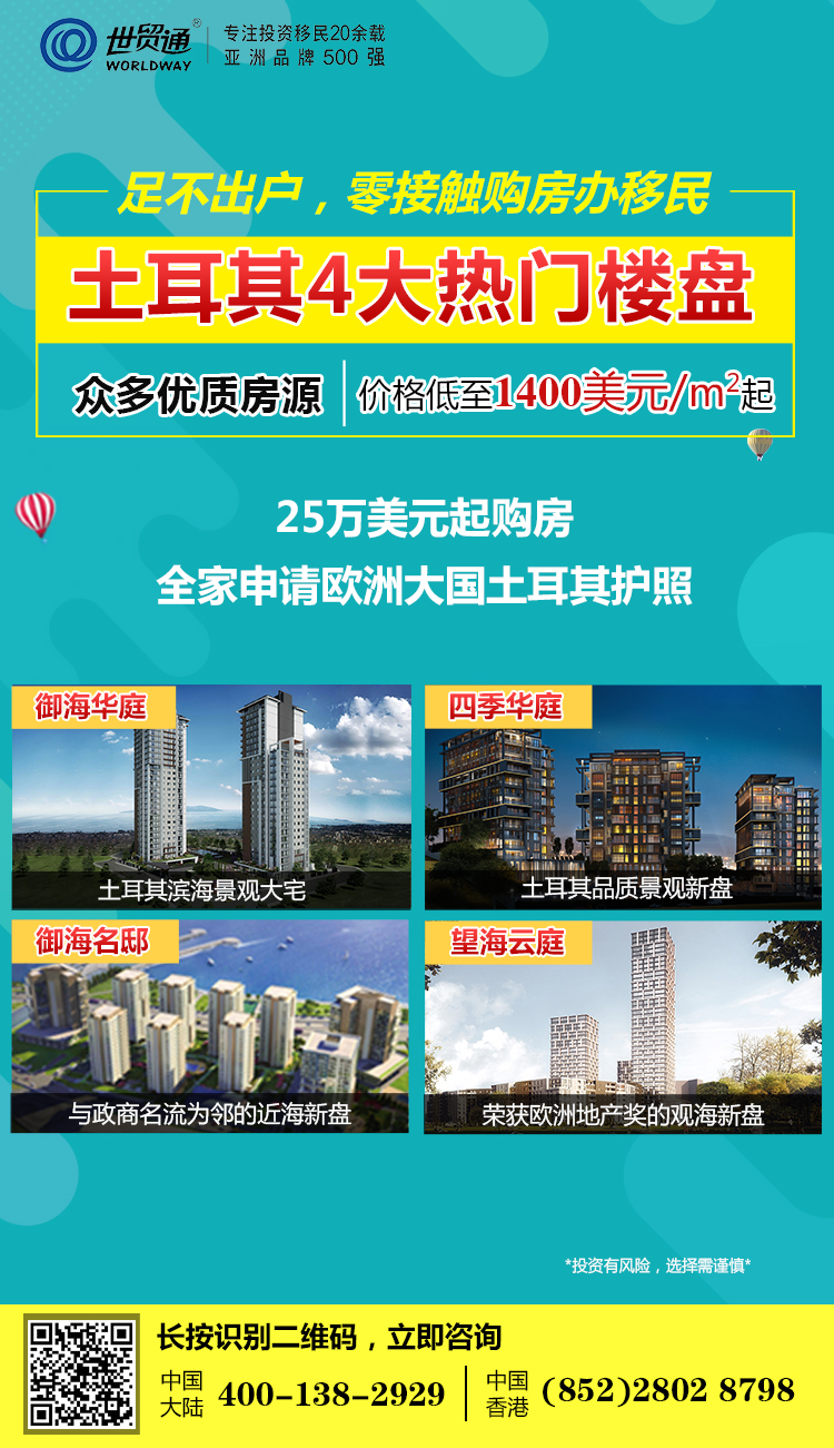 世贸通除了携手土耳其实力开发商向广大投资者介绍的土耳其御海华庭项目,还有四季华庭、御海名邸、望海云庭,亦是目前市场上较受欢迎的项目!精装大现房、投资自住两相宜……多种需求,任君选择!25万美金起购房,全家申请欧洲大国土耳其护照!