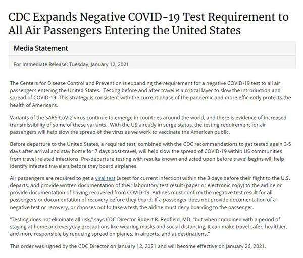 近日,美国疾病控制和预防中心(CDC)发布公告:从2021年1月26日起,所有乘坐国际航班入境美国的旅客(包括美国公民),都需要在登机前三日内进行新冠病毒检测,并向航空公司提供阴性测试结果或新冠肺炎已康复证明文件(纸质或电子版),否则将无法登机。