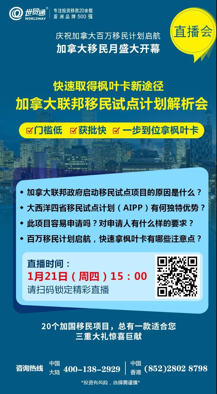 目前,正值加拿大移民月期间,限时大优惠火热进行中,2021年1月三重大礼惊喜巨献,天天红包大派送;《百万移民计划白皮书》《速获枫叶卡Q&A手册》免费领取,更多优惠,请咨询世贸通集团服务热线,中国大陆:400-138-2929 中国香港:(852)2802 8798。