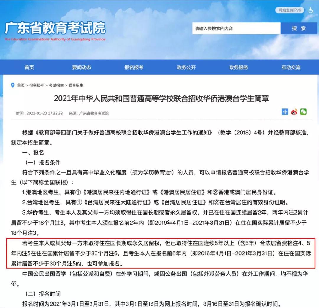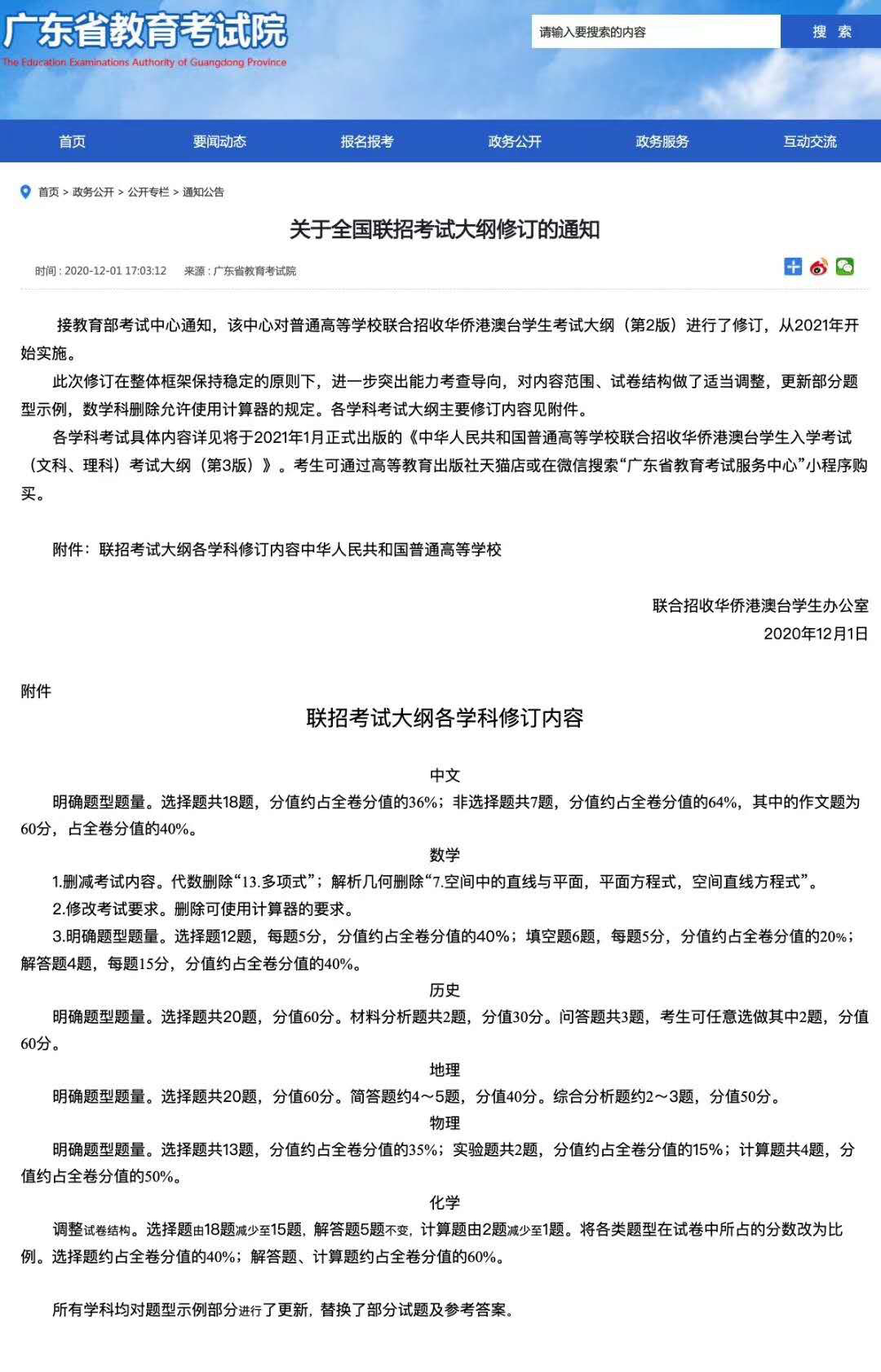 不过,今年华侨生联考迎来一则利好消息:此前广东省考试院发布了一则《关于全国联招考试大纲修订的通知》,内容是教育部考试中心对普通高等学校联合招收华侨港澳台学生考试大纲(第2版)进行了修订,新大纲从2021年开始实施