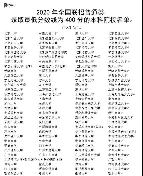华侨生考试相较普通高考,不仅考题简单,录取分数线低;并且报考人数少,每年招生指标都用不完!而且全国有336所普通高校联合招收港澳台华侨生,我们来看看2020年最低分数线400分可以录取的本科院校有130所,可以看到名单中有北京大学、清华大学、北京理工大学、北京人民大学等等,几乎涵盖985、211。