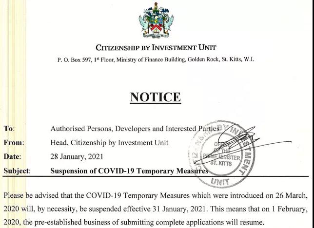 圣基茨移民局最新出台政府公告:圣基茨移民申请的文件递交,自2021年2月1日起,恢复纸质递交,结束疫情期间的暂行措施。