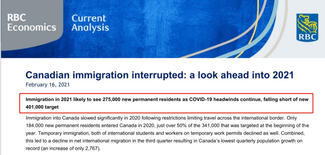 近日,加拿大皇家银行(RBC)经济学家安德鲁·阿格普索维奇对2021年加拿大移民趋势进行了全新的预测分析,结果显示:加拿大在今年或将无法达到移民目标,乐观情况下最多迎来27.5万人,这与40.1万新移民的移民计划相比,移民缺口将高达12.6万!