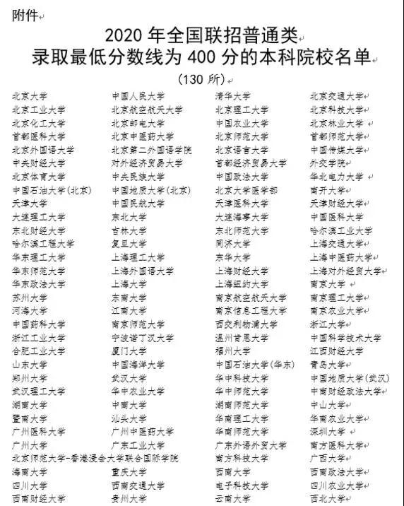 与普通高考相比,华侨生联考虽然也要参加考试,但是考试难度却很低,录取分数线也很低,400分左右就能上国内名牌大学。在官方公布的2020年全国联招普通类录取最低分数线为400分的本科院校名单中,清华、北大等国内学生梦寐以求的一流大学均在其中。同样的大学,与普通高考考生相比,华侨生联考考生更容易被录取!