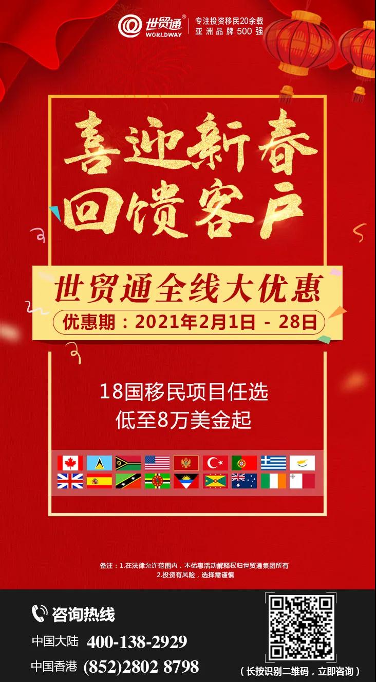 目前,世贸通全线大优惠,新春回馈活动火爆进行中!2021年2月1日-28日,投资世贸通热门项目,可享多重优惠!更多详情,请拨打世贸通服务热线,中国大陆:400-138-2929 中国香港:(852) 2802 8798。