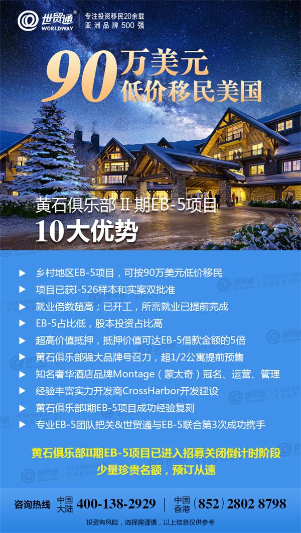 好项目不等人,遗憾错过50万美元投资移民美国机会,切不可再错过90万美元投资移民美国机会,优质项目可遇不可求,黄石俱乐部II期EB-5项目已进入招募关闭倒计时阶段,少量珍贵名额,预订从速。更多详情,请拨打世贸通服务热线,中国大陆:400-138-2929 中国香港:(852)2802 8798