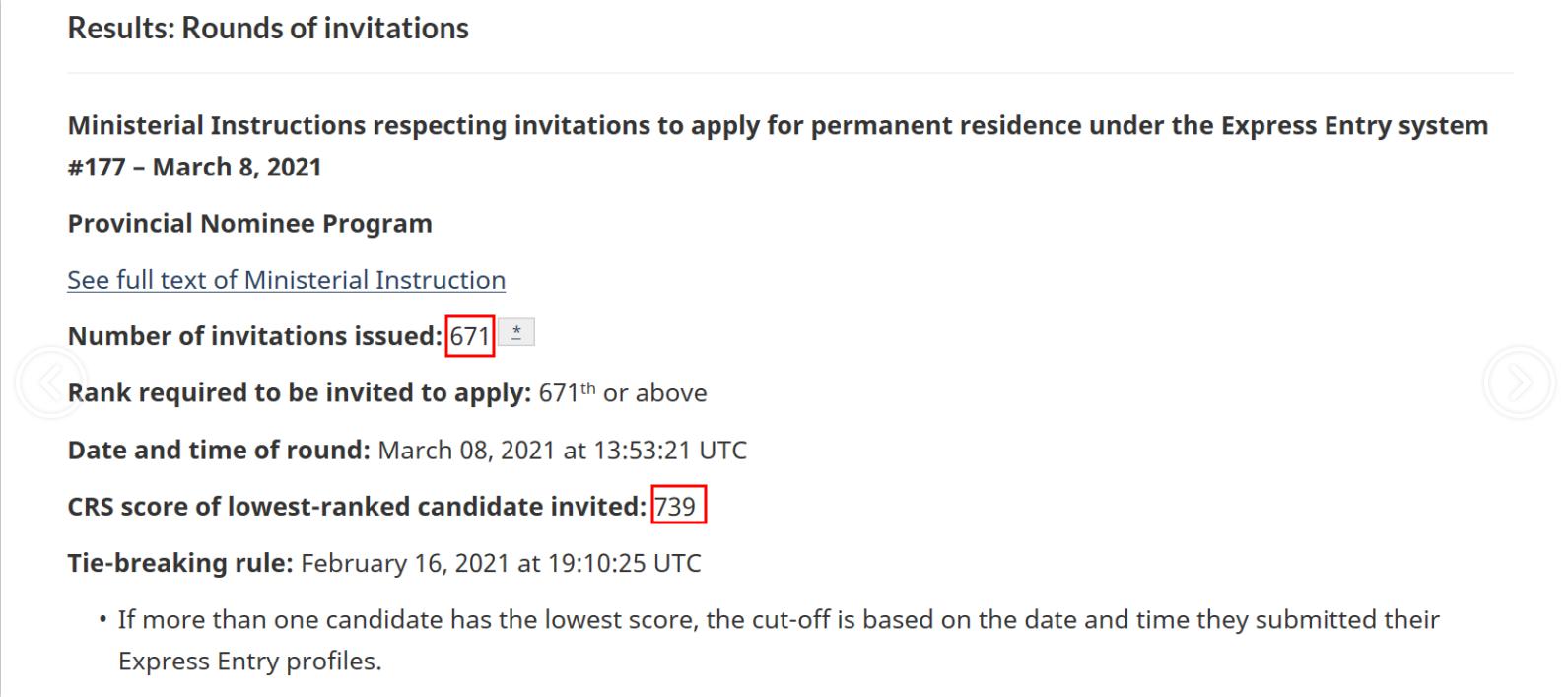近日,加拿大联邦快速移民通道(Express Entry)发布了新一轮邀请,即第177次邀请。此次邀请针对在2021年2月16日之前入池获省提名类别的申请人,总共发出邀请人数为671人,最低分739分。邀请分数之所以较高是因为获得快速通道省提名计划邀请的申请人,在快速通道CRS的基础分数上会自动获得额外600分。