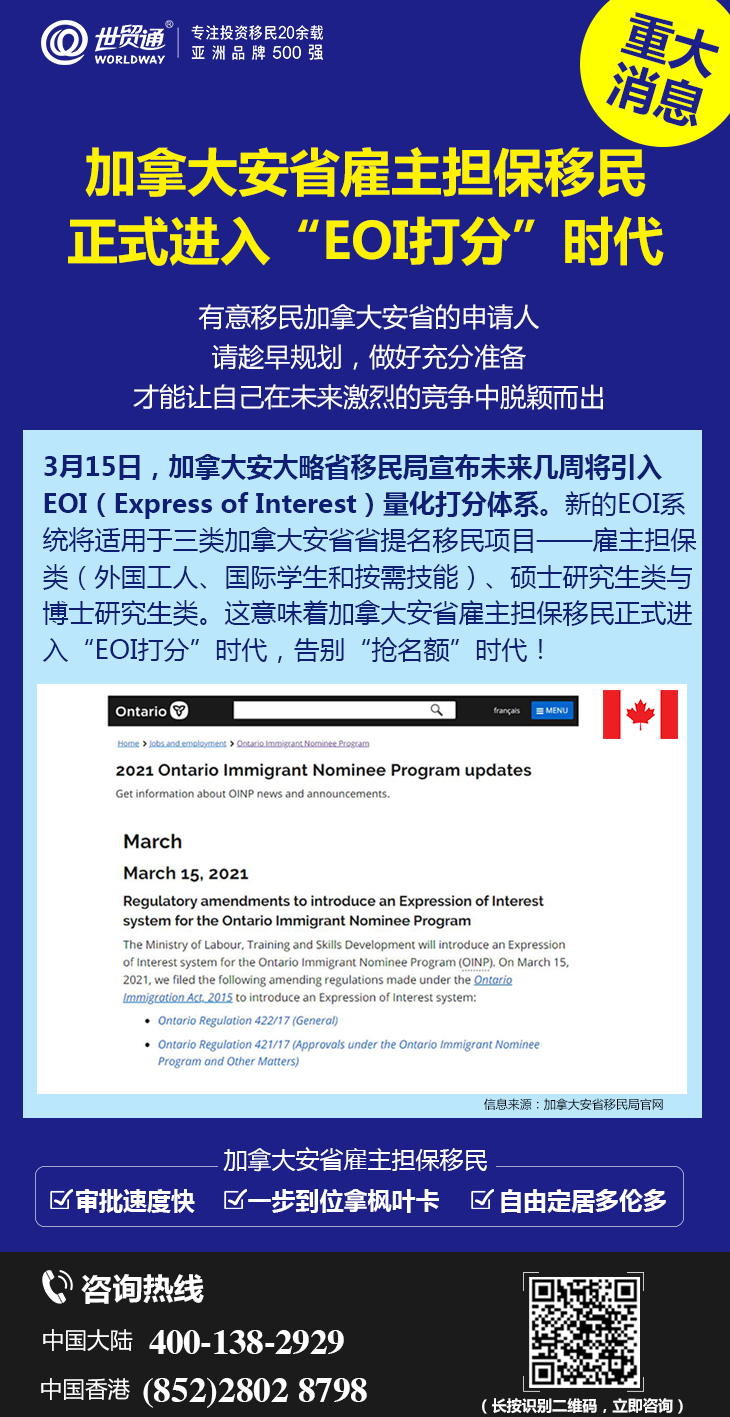 安大略省雇主担保移民项目是加拿大人口第一大省、经济、金融、科技强省安大略省推出的省提名项目,旨在为安大略省吸引有经验或技术的新移民,自推出以来就备受追捧。EOI新政后,意味着加拿大安省雇主担保移民正式进入“EOI打分”时代,告别“先到先得抢配额”时代。