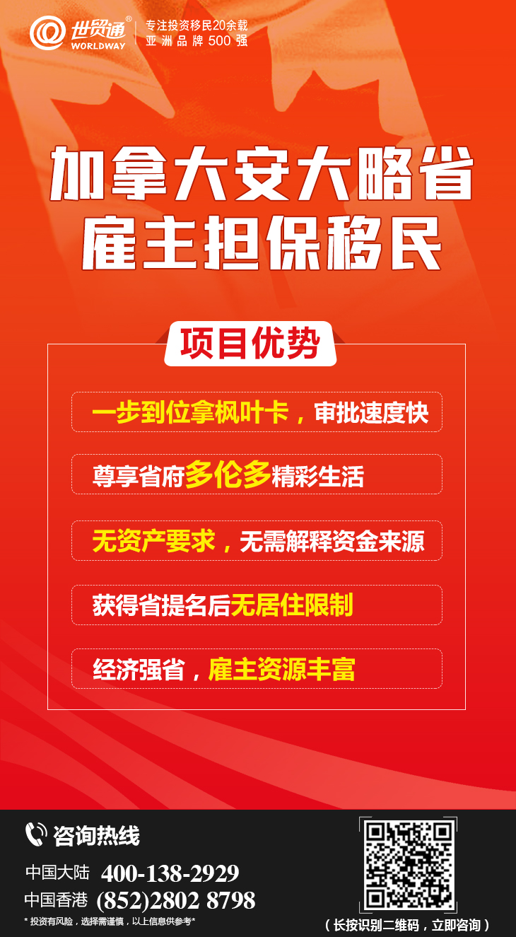 亚洲品牌500强世贸通集团,拥有业内规模强大的项目分析团队、专业的文案团队及完善的客服团队,并与加拿大众多实力机构合作,为投资者提供专业、全面、多样化的服务,全力以赴助力投资者把握加拿大移民黄金期!更多详情,请拨打世贸通服务热线,中国大陆:400-138-2929 中国香港:(852) 2802 8798 。