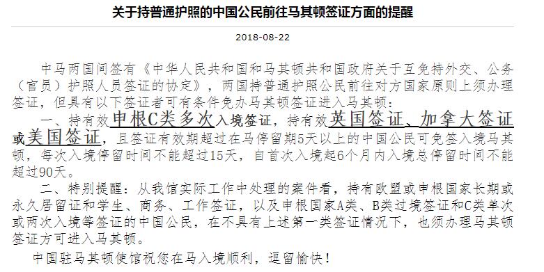 《关于持普通护照的中国公民前往马其顿签证方面的提醒》