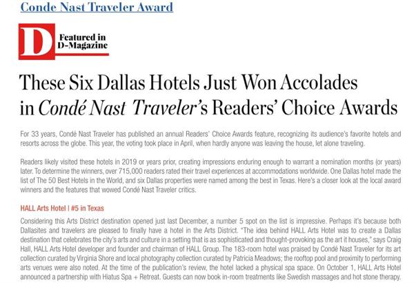 世贸通集团移民客户投资的达拉斯1号EB-5项目喜讯不断。据项目方披露:达拉斯1号EB-5项目酒店——豪尔艺术酒店在“Conde Nast Traveler”杂志“读者选择奖”评选中表现亮眼,取得了德州酒店排名第五、达拉斯酒店排名第二的好成绩,这是一个全国性的荣誉。“Conde Nast Traveler”过去33年以来,根据读者自己全球旅行和酒店住宿体验打分评选,每年发布一次“读者选择奖”。