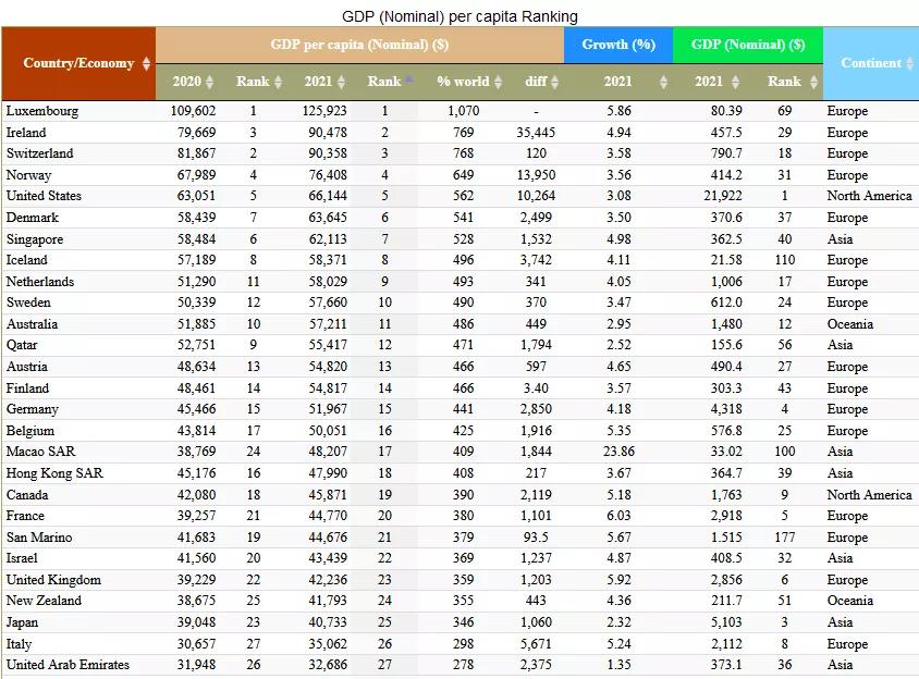 人均GDP是一个国家或地区的GDP与当地人口总数的比值,是衡量当地人民生活水平的指标。近年来,爱尔兰人均GDP不断增长,根据“Statistics Times”发布的最新数据显示,2021年爱尔兰人均GDP全球排名第二,数值为90478,为英语国家第一。