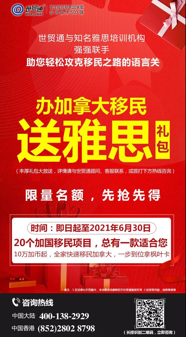 目前,世贸通正开展“办加拿大移民,送雅思礼包”活动,即日起至2021年6月30日,限量名额,先抢先得!20个加国移民项目,总有一款适合您!更多详情,请拨打世贸通服务热线,中国大陆:400-138-2929 中国香港:(852) 2802 8798。