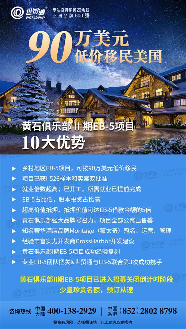优质项目可遇不可求,黄石俱乐部II期EB-5项目已进入招募关闭倒计时阶段,少量珍贵名额,预订从速。更多详情,请拨打世贸通服务热线,中国大陆:400-138-2929 中国香港:(852)2802 8798。