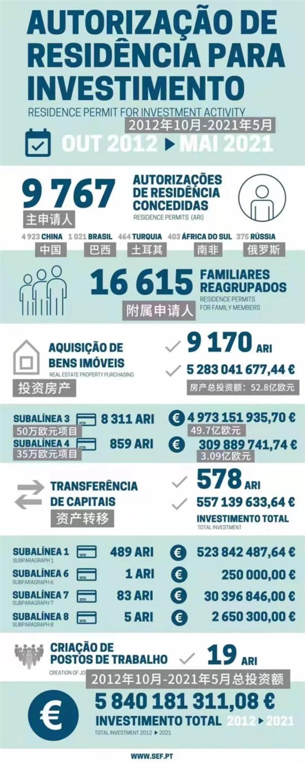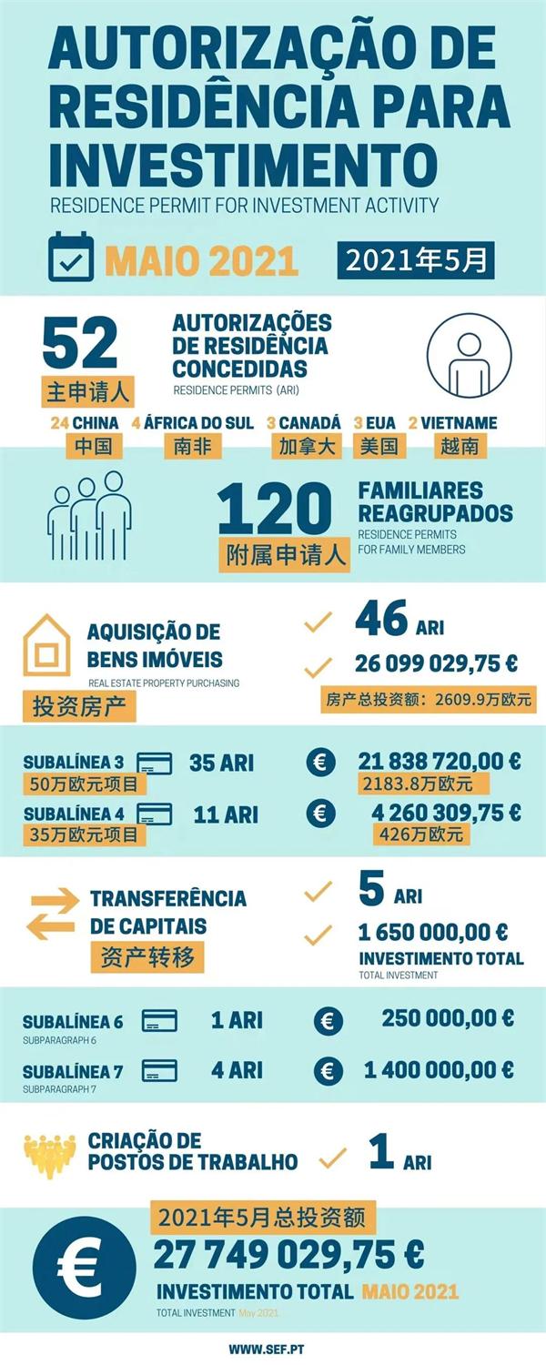 近日,葡萄牙移民局(SEF)公布了2021年5月份的黄金签证数据。2021年5月份,共计有52位主申请人和120位附属申请获批葡萄牙黄金签证,投资额为2774.9万欧元。其中,来自中国的投资者仍遥遥领先。