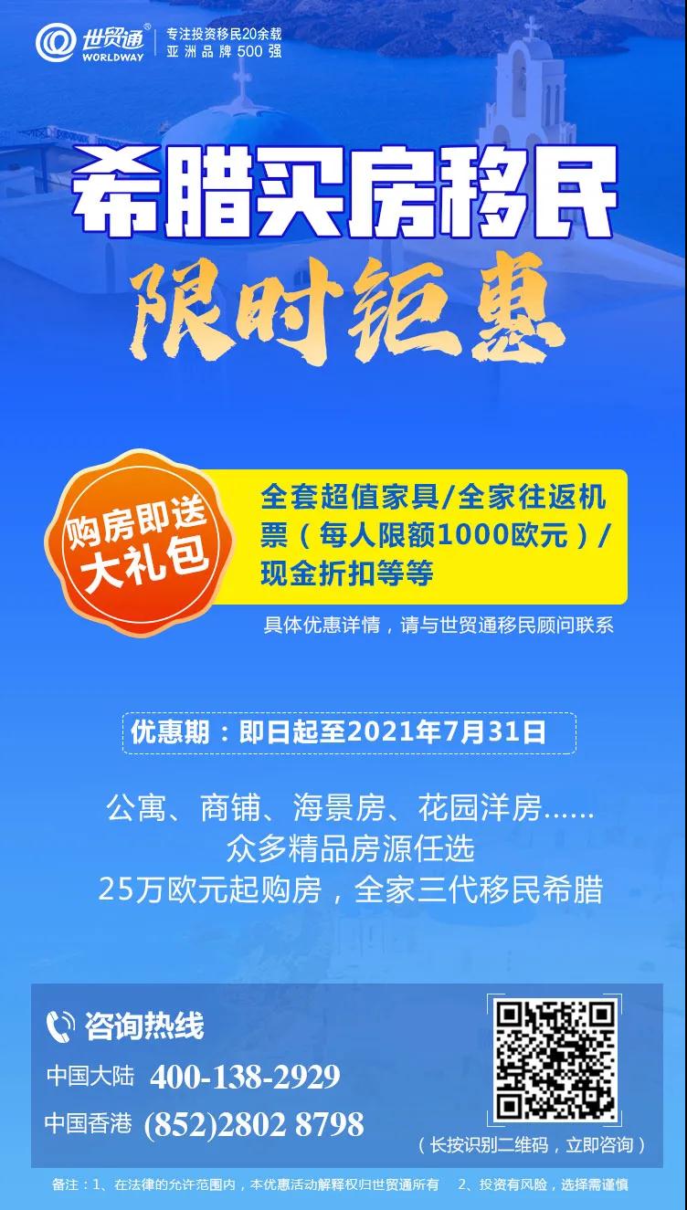 希腊经济前景大好,现在正是投资希腊的好时机!目前,投资者通过希腊黄金签证计划项目,投资25万欧元起的房产,不仅可全家三代申请希腊永久居留签证,畅行26个申根国,同时还能享受希腊教育、医疗等社会福利待遇,而且还可收获希腊永久产权的房产,建立海外第二家园,可谓一举多得。目前,正值希腊买房移民优惠期,机会难得,购房即可获大礼包,有意者须及时把握好时机!