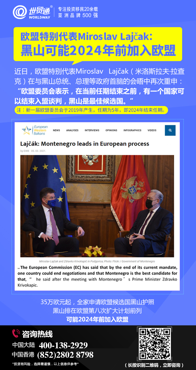 在开放投资入籍项目的国家中,黑山是欧盟第八次扩大计划——东扩目标区排名靠前的欧盟候选国。黑山即将加入欧盟,是明确记载于欧盟委员会新的战略决策——西巴尔干战略!黑山投资入籍项目的推出为投资者开辟了获得未来欧盟公民身份的蹊径,到时拥有的黑山护照将升级为欧盟护照!在塞浦路斯欧盟护照项目关停,马耳他欧盟护照项目投资门槛大幅提升之际,黑山投资入籍项目将是快速获取未来欧盟护照的便捷方式,早行动早受益!