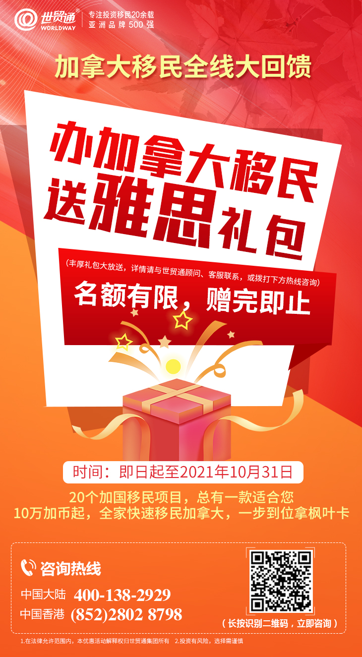 即日起至2021年10月31日,加拿大移民全线大回馈,办加拿大移民,送雅思礼包,名额有限,赠完即止。