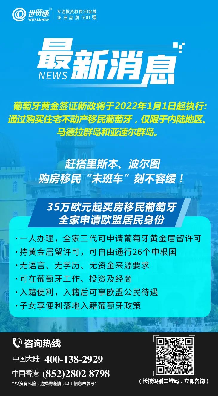 移民赶早不赶晚!根据葡萄牙政府颁布的2021年第14法条,从2022年1月1日起,通过购买住宅不动产移民葡萄牙,将仅限于内陆地区、马德拉群岛和亚速尔群岛。对于备受中国投资者青睐的两大热门投资城市,里斯本以及波尔图,根据新政,将不再符合葡萄牙黄金居留法案。有意向在里斯本波尔图购房投资拿身份、申请欧盟护照的投资者,务必抓住最后几个月的“窗口期”,跑步入场,赶搭里斯本、波尔图购房移民“末班车”,早申请早受益!