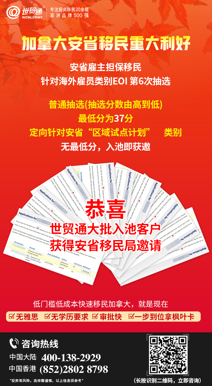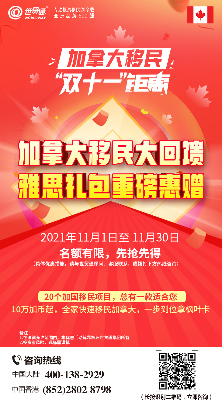 关于“加拿大移民,双十一钜惠”活动的更多详情,请在评论区私信我们,或拨打世贸通服务热线,中国大陆:400-138-2929 ,中国香港:(852)2802 8798