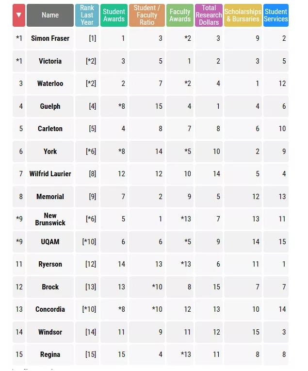 其他TOP15综合类大学还有:约克大学、劳里埃大学、纽芬兰纪念大学、新不伦瑞克大学、魁北克大学、瑞尔森大学、布鲁克大学、康考迪亚大学、温莎大学、里贾纳大学。