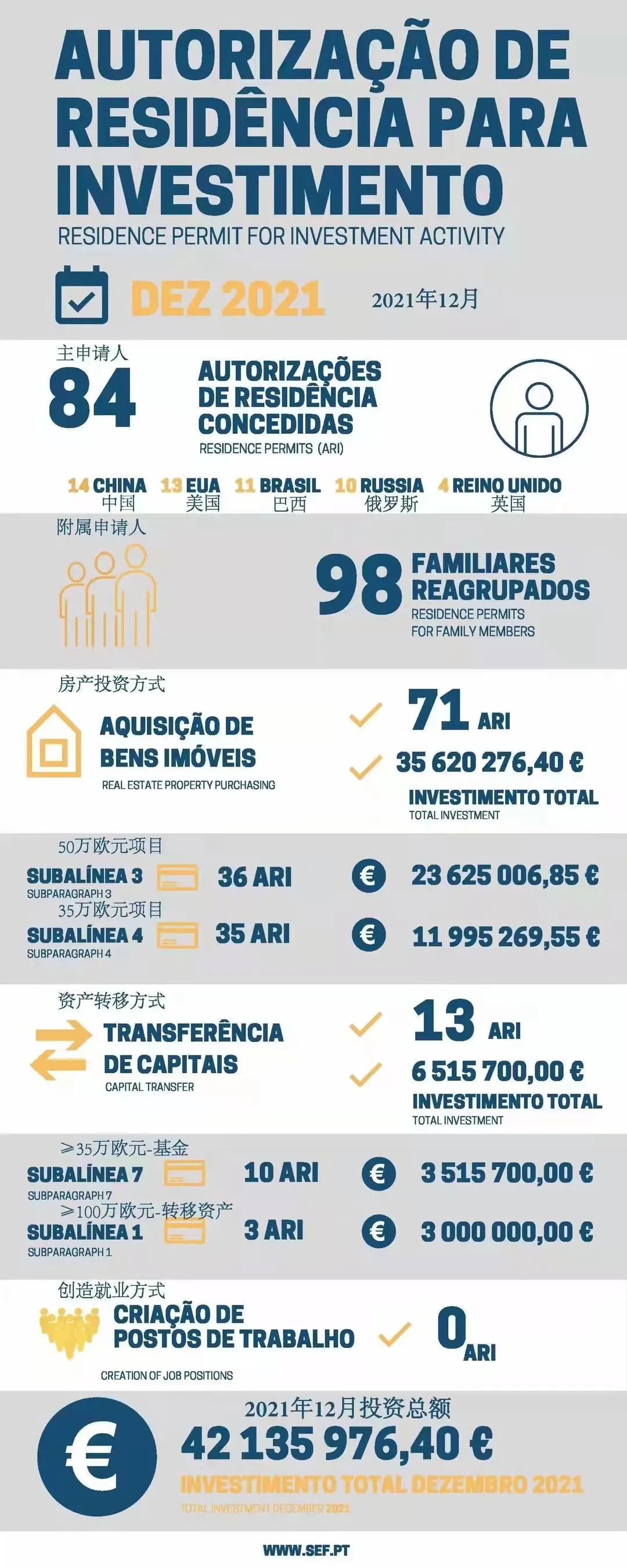 近日,葡萄牙移民局(SEF)公布了2021年12月份的黄金签证数据。2021年12月份,共计有84位主申请人和98位附属申请获批葡萄牙黄金签证,其中,来自中国的申请人达到了14位,排名第一。此外,与 2020年同期相比,2021年12月通过黄金签证获得的投资增加了52%,达到 4213.5万欧元,2020年12月投资额为2770万欧元。