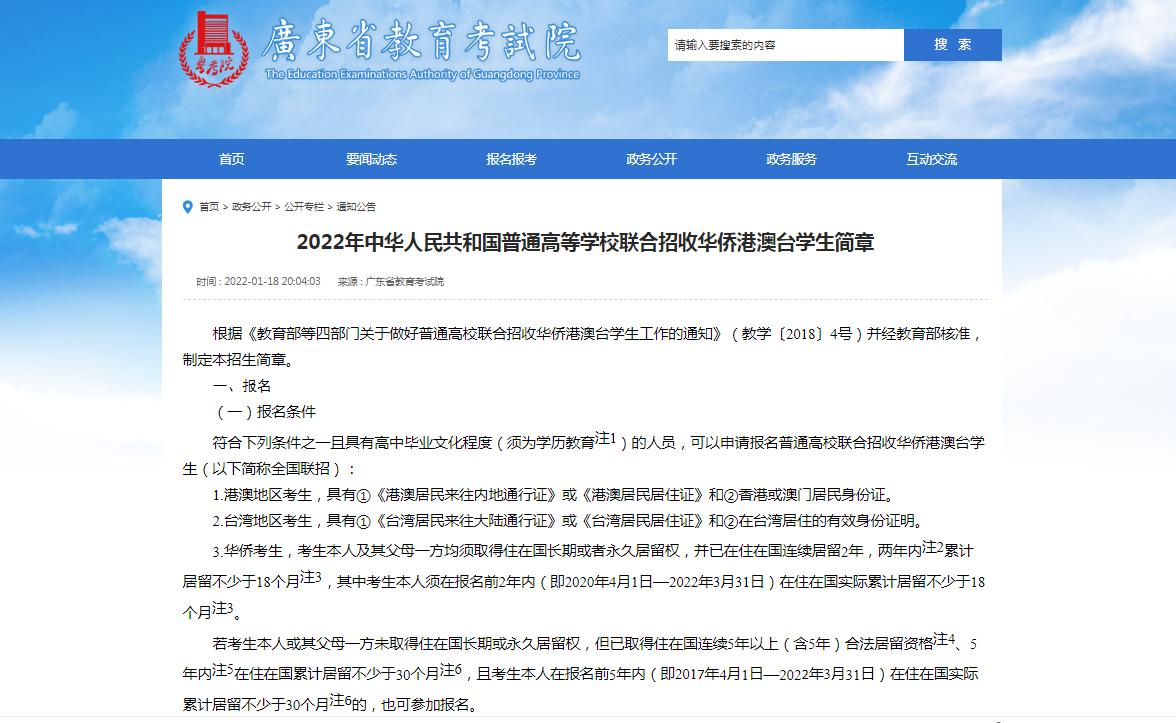 重磅提醒!近日,根据广东省教育考试院发布的《2022年中华人民共和国普通高等学校联合招收华侨港澳台学生简章》,2022年华侨生联考报名时间为2022年3月1日至3月31日,其中3月1日至15日为网上报名时间,3月16日至31日为报名确认时间。