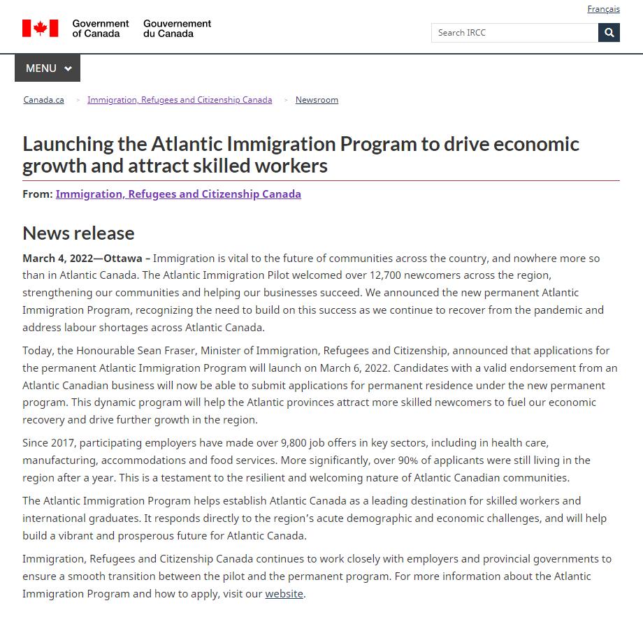 2022年3月6日起,大西洋移民计划(AIP)开始接收新的移民申请,这意味着持有效省背书(Endorsement)的申请人可以通过该项目向加拿大移民局递交PR申请了!