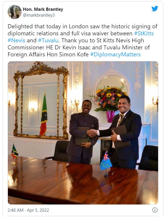 近日,圣基茨和尼维斯再次扩大外交足迹,与图瓦卢签署了全面免签证协议。圣基茨外交部长马克·布兰特利对这一举措表示赞赏,并表示圣基茨和尼维斯将继续增加其在世界各地的外交存在,并正在与不同国家建立友谊。