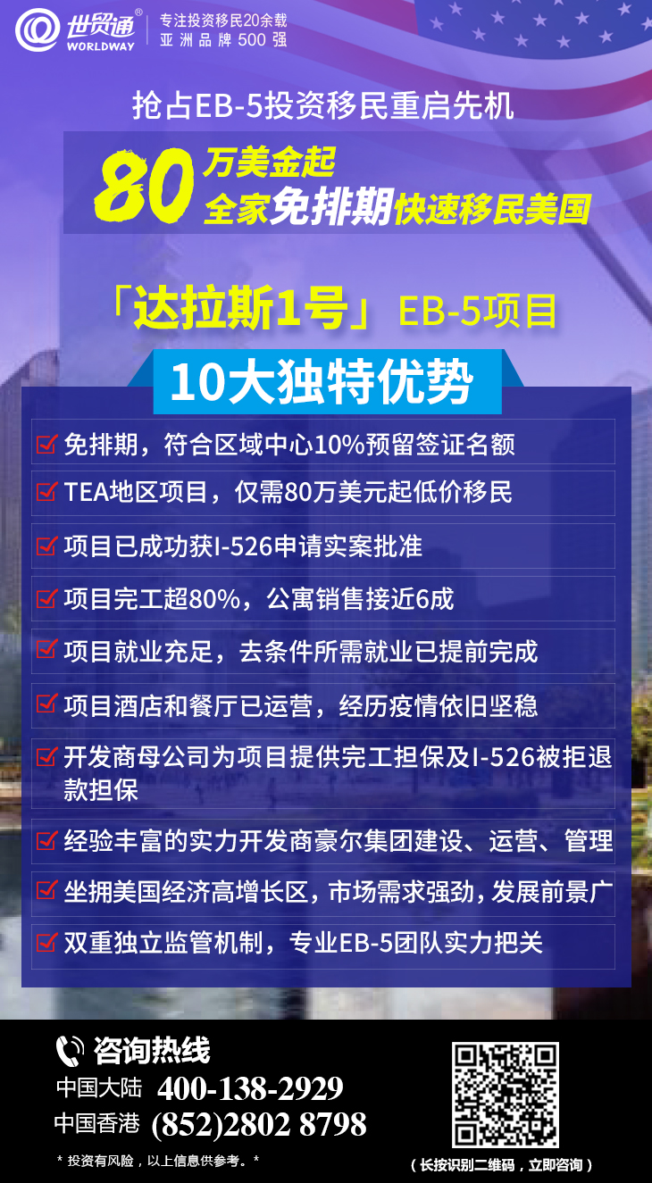 高失业率地区(TEA)项目,免排期,快速获绿卡,移民美国,优先机会,达拉斯1号EB-5项目名额稀缺,全球仅限45席,认购从速。想要抢占先机,提前锁定预留签证配额,快速取得美国绿卡的朋友,千万不要错过! 更多详情,请拨打世贸通服务热线,中国大陆:400-138-2929 中国香港:(852)2802 8798。