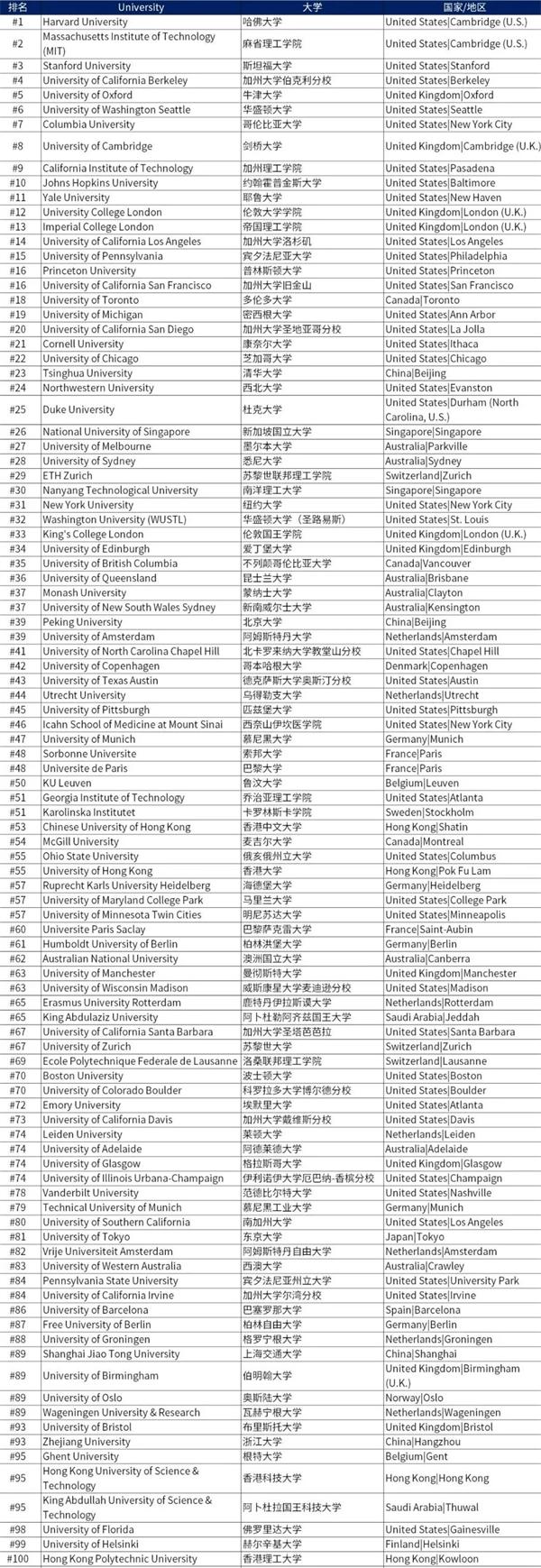 此次排名中,前10名中美国学校依旧霸榜,占据了八个席位。哈佛大学继续蝉联榜首,领跑全球;麻省理工学院紧跟其后,排名第二;斯坦福大学排名第三;加州大学伯克利分校排名第四;华盛顿大学西雅图排名第六;哥伦比亚大学排名第七;加州理工学院排名第九;约翰霍普金斯大学排名第十。在TOP 20院校中,有15所美国院校上榜;在TOP 100院校中,美国院校的表现突出,占了41位。