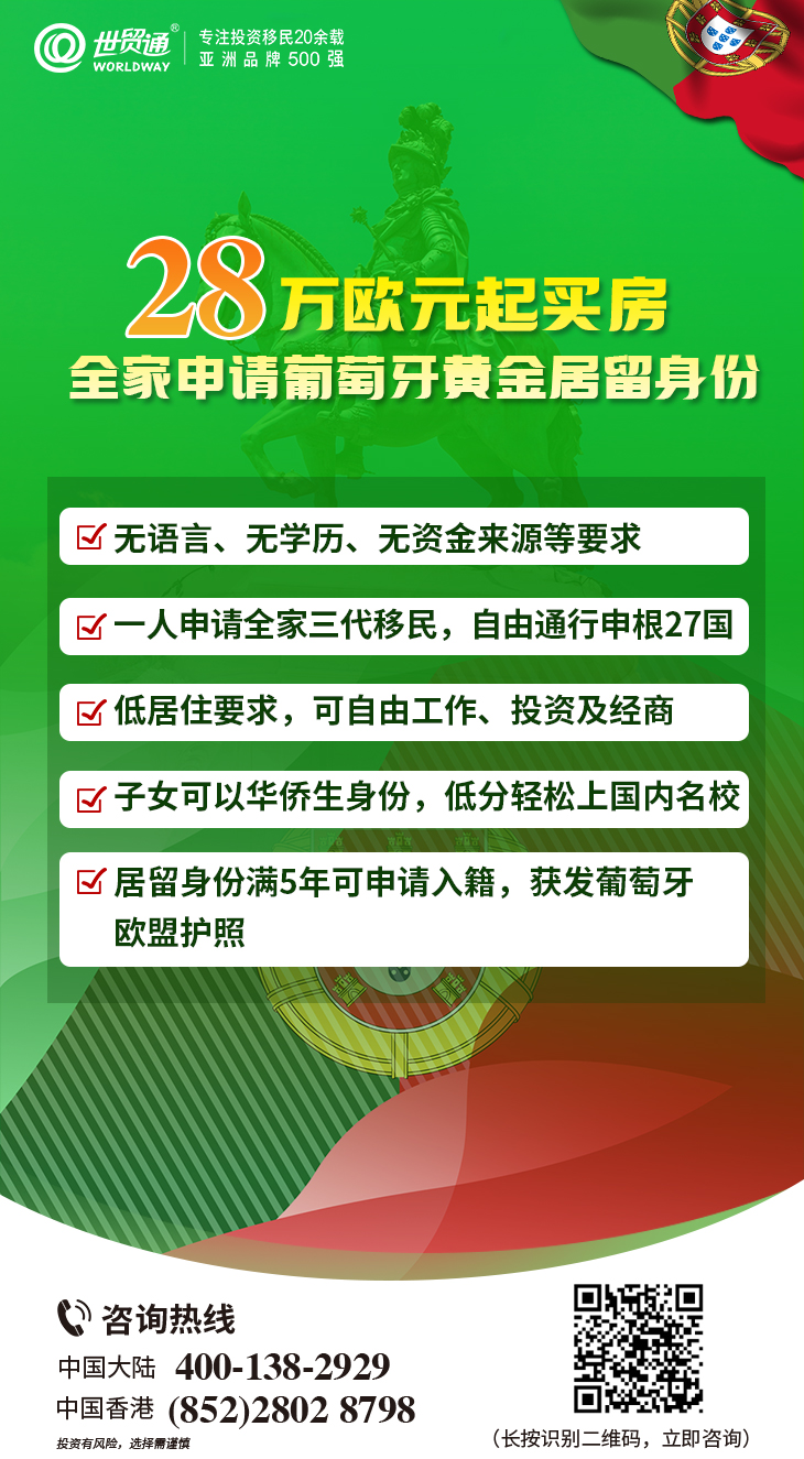 目前,移民市场上能快速获得欧盟身份的项目已经不多,而葡萄牙黄金居留项目正是可以低门槛获取欧盟护照的上佳跳板。投资者通过葡萄牙黄金居留计划,投资28万欧元起买房,可全家三代申请葡萄牙黄金居留身份,享受葡萄牙优厚社会福利和优质教育资源,自由通行27个申根国,并且满足相应条件,孩子可以以华侨生身份参加华侨生联考,低分轻松入读985、211等名校,享受内地高校教育,可谓一举多得!同时,持葡萄牙黄金居留许可签证满5年且满足每年7天的低居住要求,就有资格申请入籍葡萄牙,获发葡萄牙欧盟护照,享受欧盟公民的优厚福利待遇。