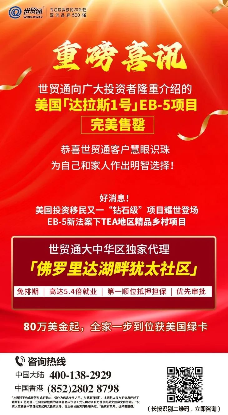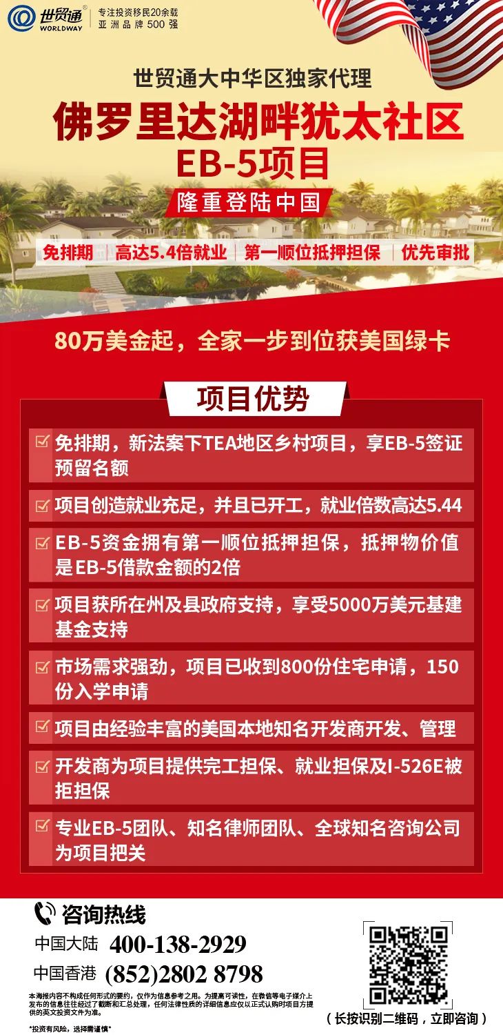 由世贸通集团担任大中华区独家代理的「佛罗里达湖畔犹太社区」EB-5项目是符合新法案下乡村地区(TEA)的EB-5项目,享EB-5签证预留名额。投资者投资80万美金起,一人申请,全家快速获绿卡,该项目拥有众多优势,绝无仅有,名额稀缺,抢购从速。