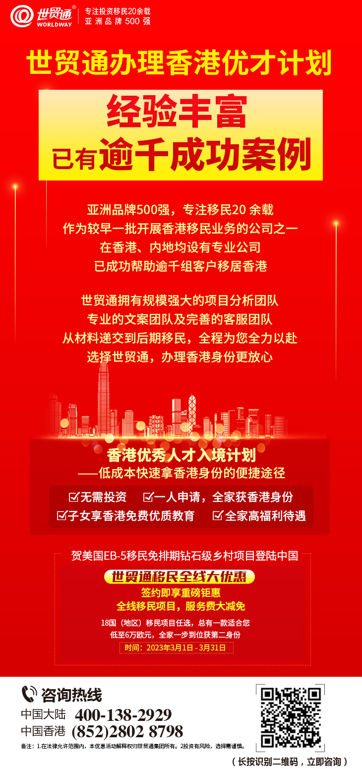 世贸通移民3月全线大优惠活动火热进行中,投资世贸通热门项目,还可享多重优惠,欢迎您的咨询。更多详情,请在评论区私信我们,或拨打世贸通服务热线,中国大陆:400-138-2929 ,中国香港:(852)2802 8798。