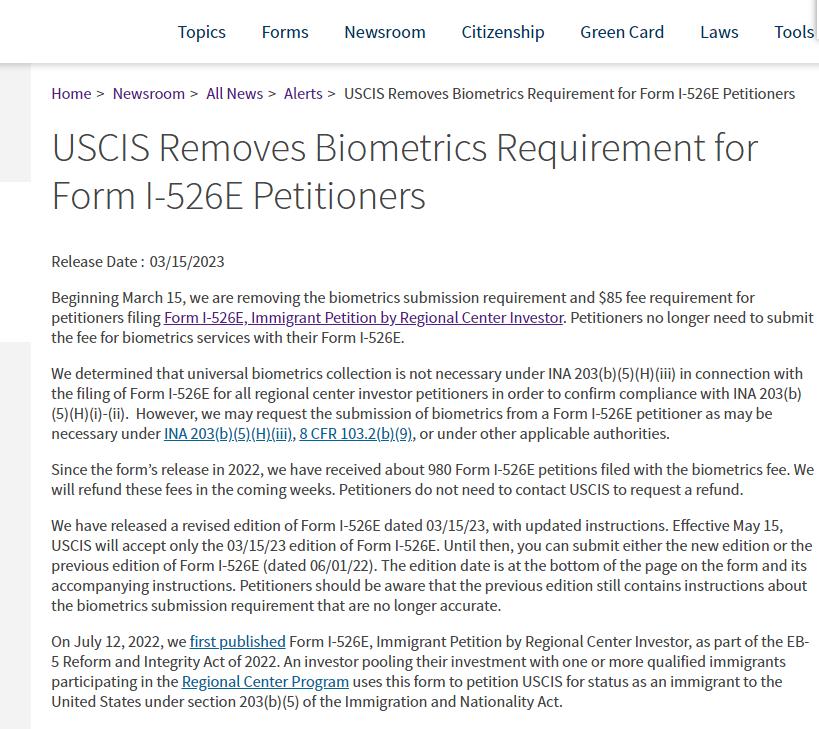 近日,美国移民局USCIS在其官网上发布正式通知:自2023年3月15日起,取消对EB-5区域中心申请人(I-526E)的指纹要求和85美元的费用要求。也就是说,EB-5区域中心投资移民申请人无须再随I-526E表提交生物识别服务费。