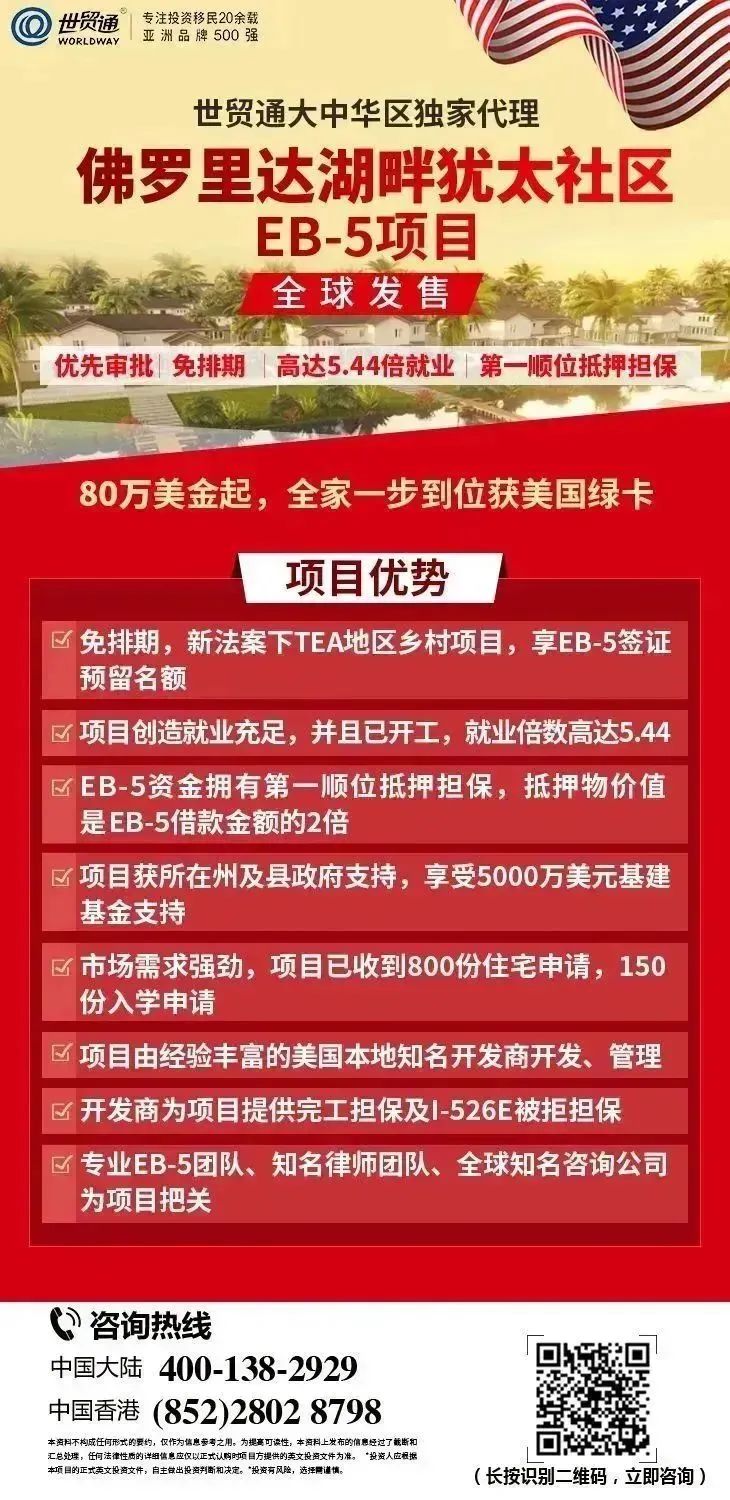 免排期快速移民美国机会,认购「佛罗里达湖畔犹太社区」EB-5项目,可享世贸通3月重磅钜惠活动!更多详情,请在评论区私信我们,或拨打世贸通服务热线,中国大陆:400-138-2929 ,中国香港:(852)2802 8798