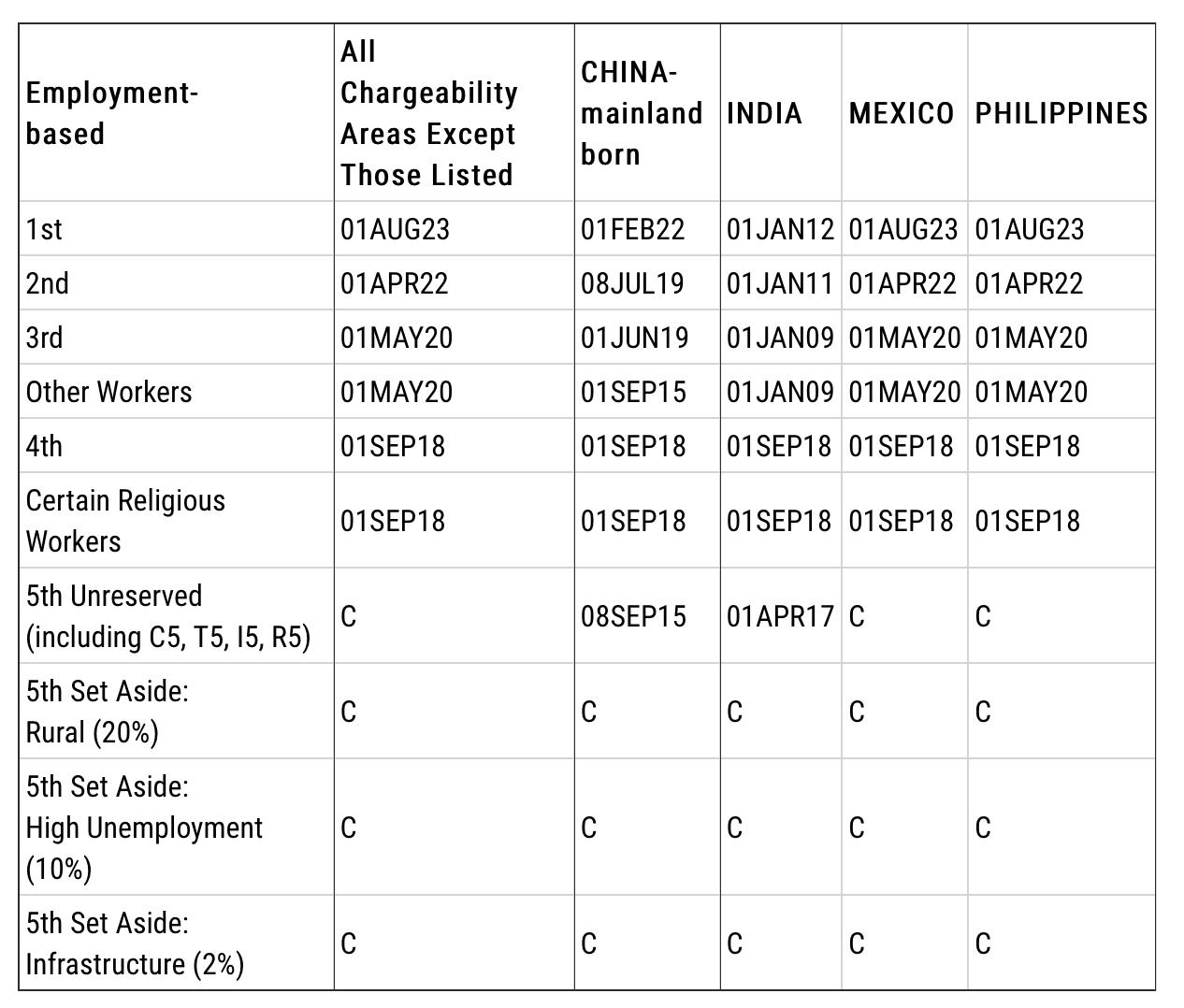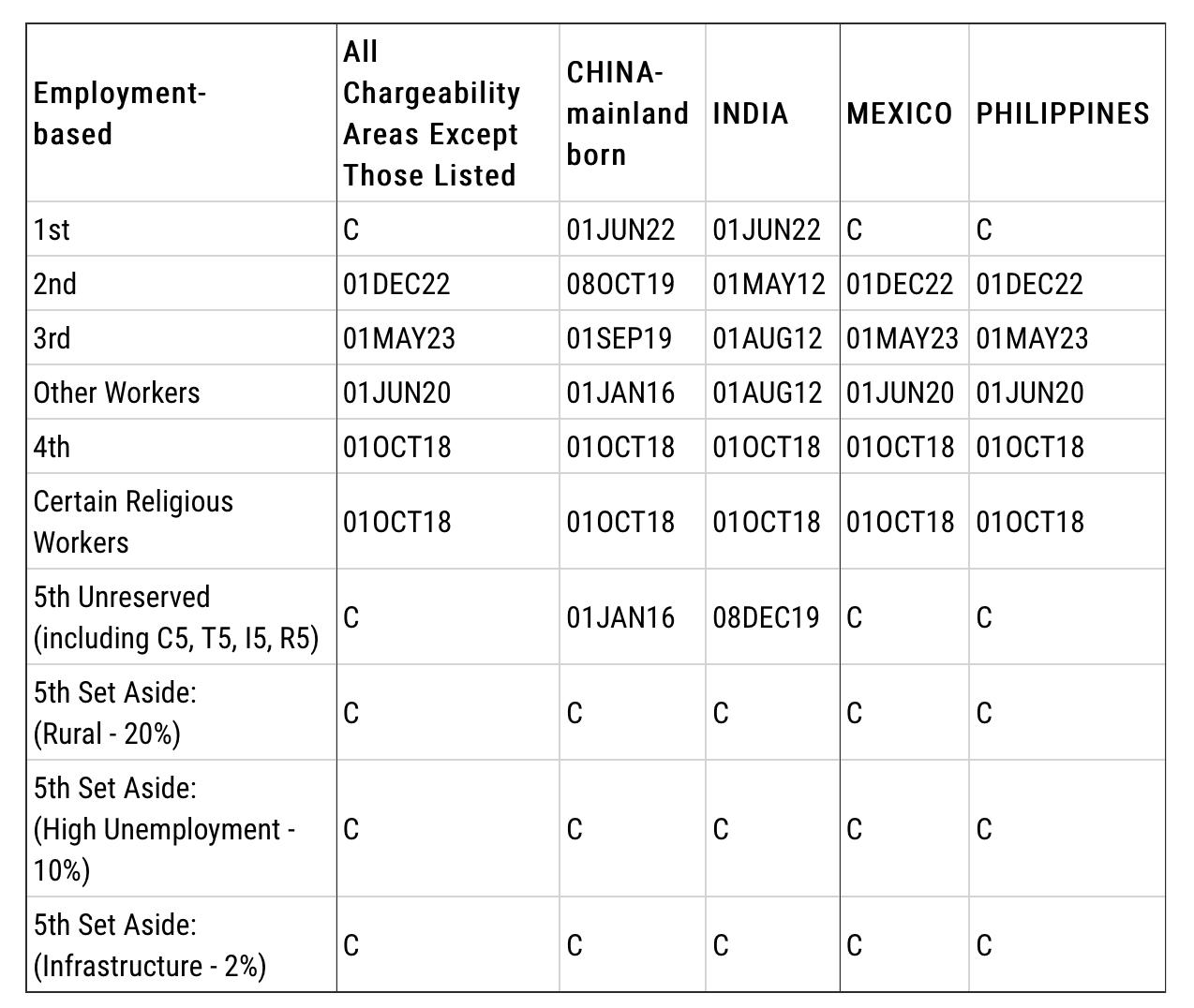 B表:Dates For Filing Of Employment-Based Visa Applications