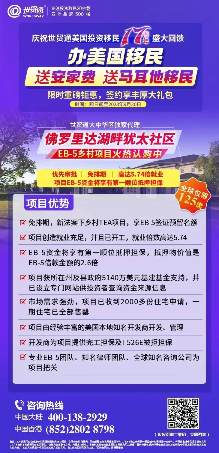 目前,由世贸通集团担任大中华区独家代理的「佛罗里达湖畔犹太社区」EB-5项目,是符合新法案下TEA地区乡村项目,不仅享EB-5签证预留名额,且获得移民局的优先审理,集免排期、项目就业倍数高达5.74、EB-5资金将享有第一顺位抵押担保等诸多优势于一身,正是助力投资人快速获美国绿卡的上佳选择!并且,该项目得到美国政府5140万美元基建基金的支持,目前已设立专门的网站https://lakefrontestatescdd.org,供投资者查询资金来源信息;项目市场需求强劲,一期住宅已经全部售罄。可遇不可求的优质乡村EB-5项目,经过一轮又一轮的抢购之后,所剩名额越来越少,好项目不等人,有意向者认购须从速!