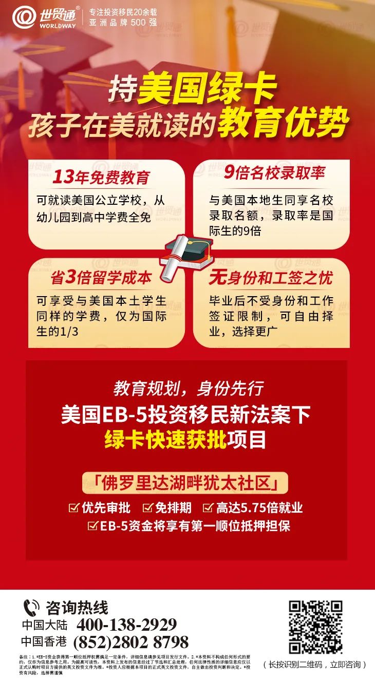 总之,绿卡身份在孩子的择校、实习、找工作等各个环节都起到了举足轻重的作用。目前,美国EB-5投资移民是快速获得美国绿卡的有效途径。申请条件宽松,无年龄、学历、语言、经商、工作经验背景等条件限制,一人申请,全家移民美国,可在美任何地方居住生活和工作,孩子享受免费公立教育(K12),配偶以及21岁以下未婚子女可一同移民。