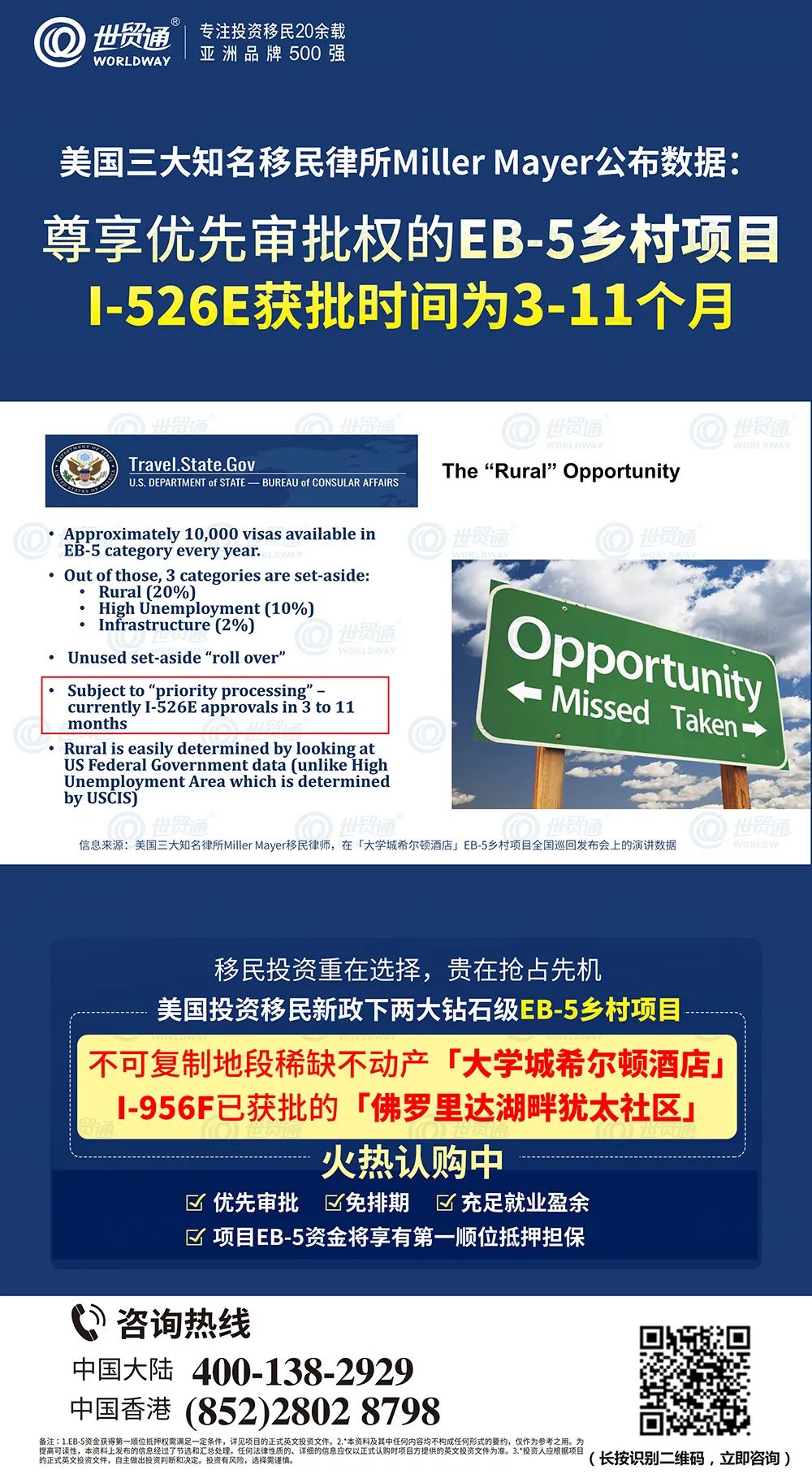 此外,由世贸通担任大中华区独家代理的,I-956F已获批的「佛罗里达湖畔犹太社区」EB-5乡村项目,同样是投资者快速移民美国的明智之选。该项目集优先审批、免排期、项目就业倍数高达5.75、EB-5资金将享有第一顺位抵押担保等诸多优势于一身,为投资者提供了快速获得美国绿卡的上佳机会!可遇不可求的优质乡村EB-5项目,经过一轮又一轮的抢购之后,目前仅剩少量名额,好项目不等人,有意向者认购须从速!