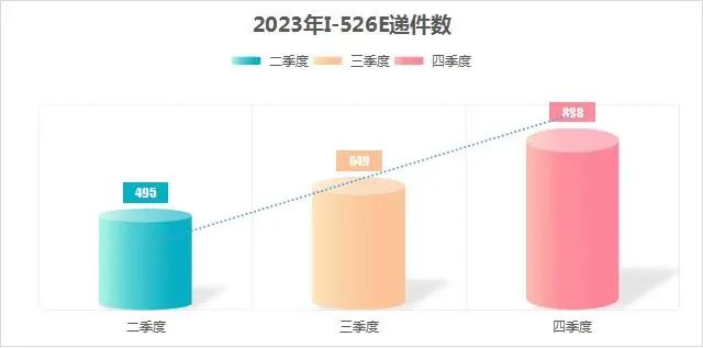 美国移民局在2023年第二季度的时候,第一次公布了新政下EB-5的I-526E递件数据,第二季度移民局共收到495份I-526E申请。与第二季度递件数相比,第三季度增加了154份,增长31%,为649份I-526E申请;第四季度增加了393份,增长79%,为888份I-526E申请。