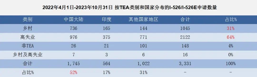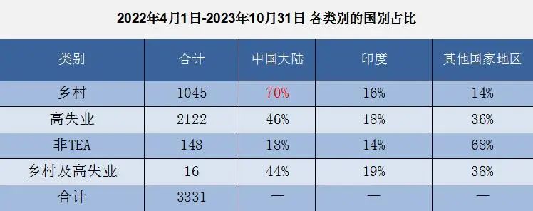 通过上表,我们可以看到,截至2023年10月31日,全球共有2122个家庭申请了城市高失业率地区(TEA)项目,其中976个家庭来自中国。全球共有1045个家庭申请了乡村地区(TEA)项目,其中736个家庭来自中国。
