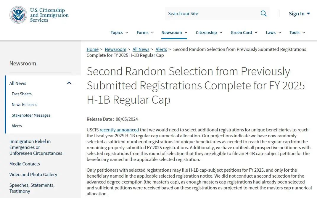 2025财年H-1B的二轮抽签已于8月5日正式结束。在此次二轮抽签中,移民局抽取了13,607位受益人,共14,534份有效注册。经过二轮“海底捞”之后,2025财年H-1B的总中签人数达到了135,137人。移民局表示,在经过两轮的抽签后,所抽取的总量可以满足年度配额上限。