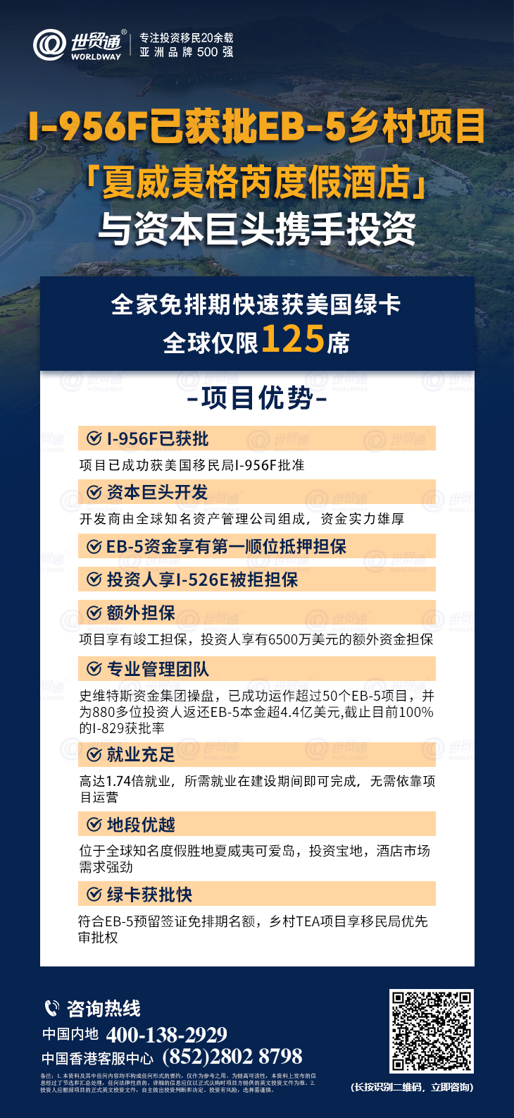目前,移民美国,市面上热销的I-956F已获批的两大精品EB-5乡村项目「阿斯彭▪科迪亚克公寓」和「夏威夷格芮度假酒店」,都是经过世贸通集团层层筛选、严格把关后的优质EB-5乡村项目,是您快速移民美国的上佳选择。