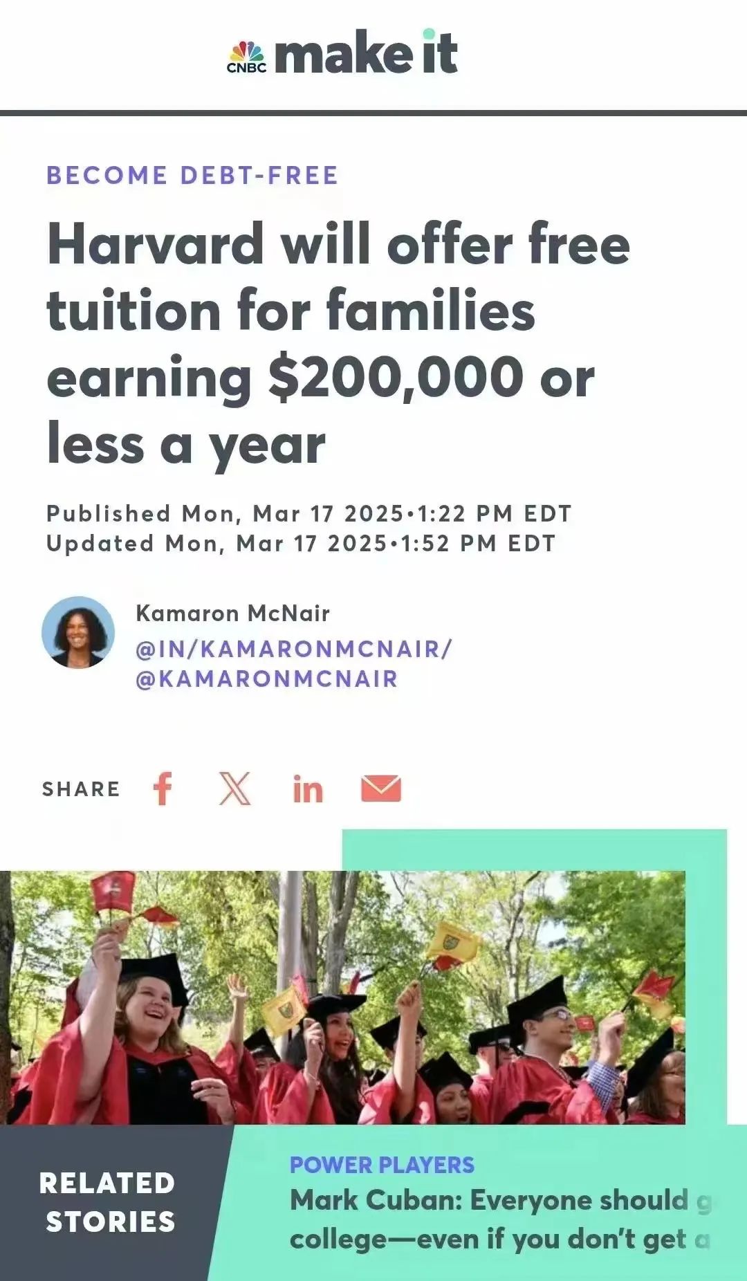 哈佛大学多年来一直致力于降低高等教育的经济壁垒。自2004年起,哈佛大学便不断调高免学费家庭收入的门槛:2004年,家庭年收入4万美元或以下的学生可享受免费学费;2006年,这一门槛提升至6万美元;2023年,家庭年收入8.5万美元或以下的学生可享受免费学费;如今,门槛已提高至20万美元,覆盖了绝大多数美国家庭。